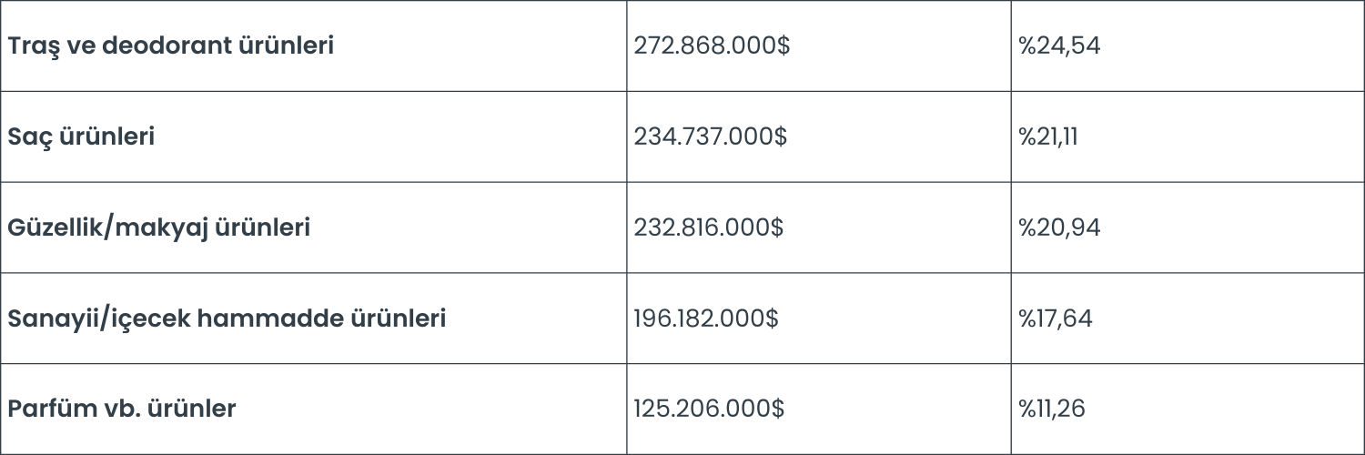 Kozmetik sektöründeki ihracatı kendi içinde ürün bazında incelemek istediğimizde ise, 2021 yılında ihracatın en büyük kısmı %24 ile tıraş ve deodorant ürünleri, %21 ile saç ürünleri ve hemen peşinden %20 ile güzellik/makyaj ürünlerinden oluştuğunu görüyoruz. Ürünlerin 2021 yılı ihracat tutarlarını bir sıra ile göstermek gerekirse;